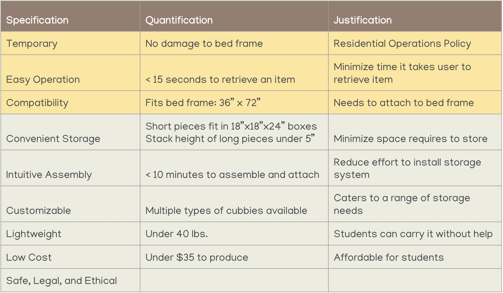 We made a specifications table to easily quantify our metrics of success and rate potential solutions.