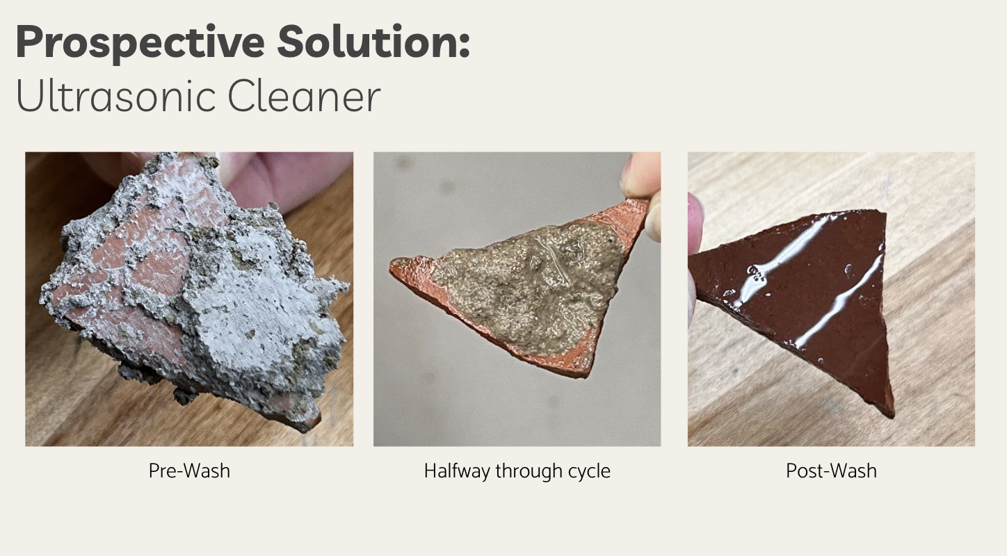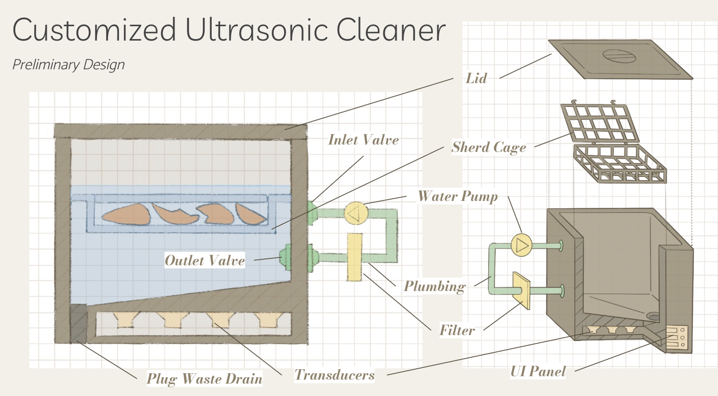 Before we started building the device, we came up with contingency plans. Some of our alternative paths included pursuing a brushing solution, rinse cycling, and trying other frequencies, powers, or transducer configurations for the ultrasonic cleaner. Another de-risking measure we took was to ship a commercially available ultrasonic cleaner to Armenia for them to replicate our testing procedure on site and ensure that it works for their sherds without causing any damage