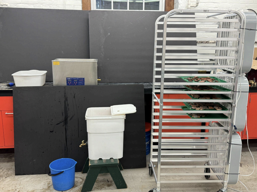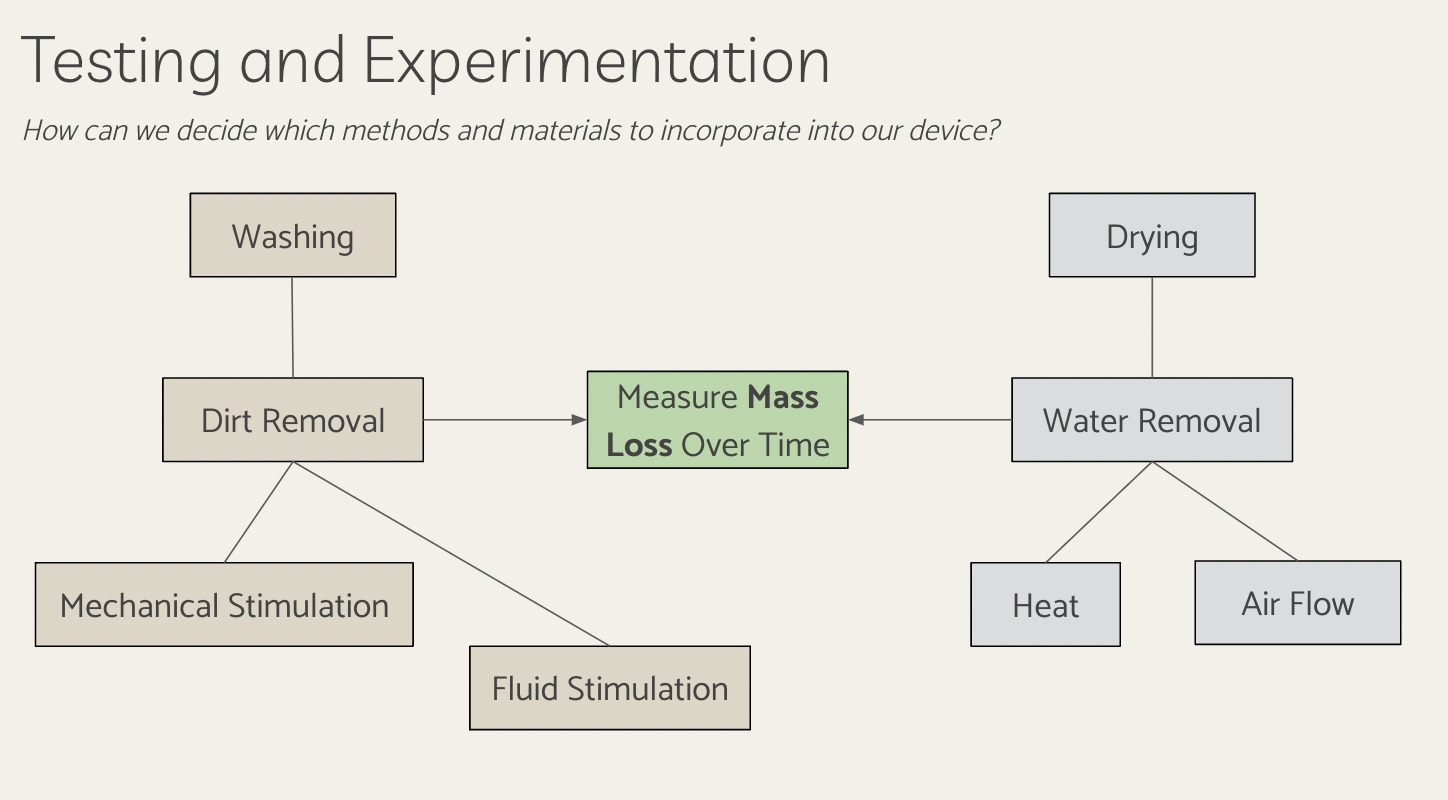 After understanding what our solution should accomplish, we brainstormed cleaning and drying techniques that could meet the specifications we have listed. For washing, the tools we thought of were various mechanical brushes, ultrasonic cleaning mechanisms, and fluid pressure systems (including air and water). We decided to test the efficiency of the aforementioned techniques.To mimic the conditions we are designing for as closely as possible, we researched the soil composition at the Vedi Fortress site in Armenia and made our own soil sample that was similar to that. We then gathered sherds and broke them up into pieces that roughly had the same size. In order to quantitatively compare them against one another, we came up with standardized testing procedures mainly looking at the percent mass difference of a sherd piece before and after being subjected to the cleaning method in question. We wrote one test report per test performed and ended up with over 10 reports. We found ultrasonic cleaning to outperform the other cleaning methods we tested for. Although ultrasonic cleaning was the winner of our cleaning testing, we wanted to conduct further in-depth ultrasonic cleaning tests to see how the conditions of ultrasonic cleaning can be optimized. We found that ultrasonic cleaners are more effective on one side of the sherd than the other. The solutions we found to be effective in tackling this were flipping the sherds during the cycle, minimal brushing, or incorporating rinse cycles in that respective order.